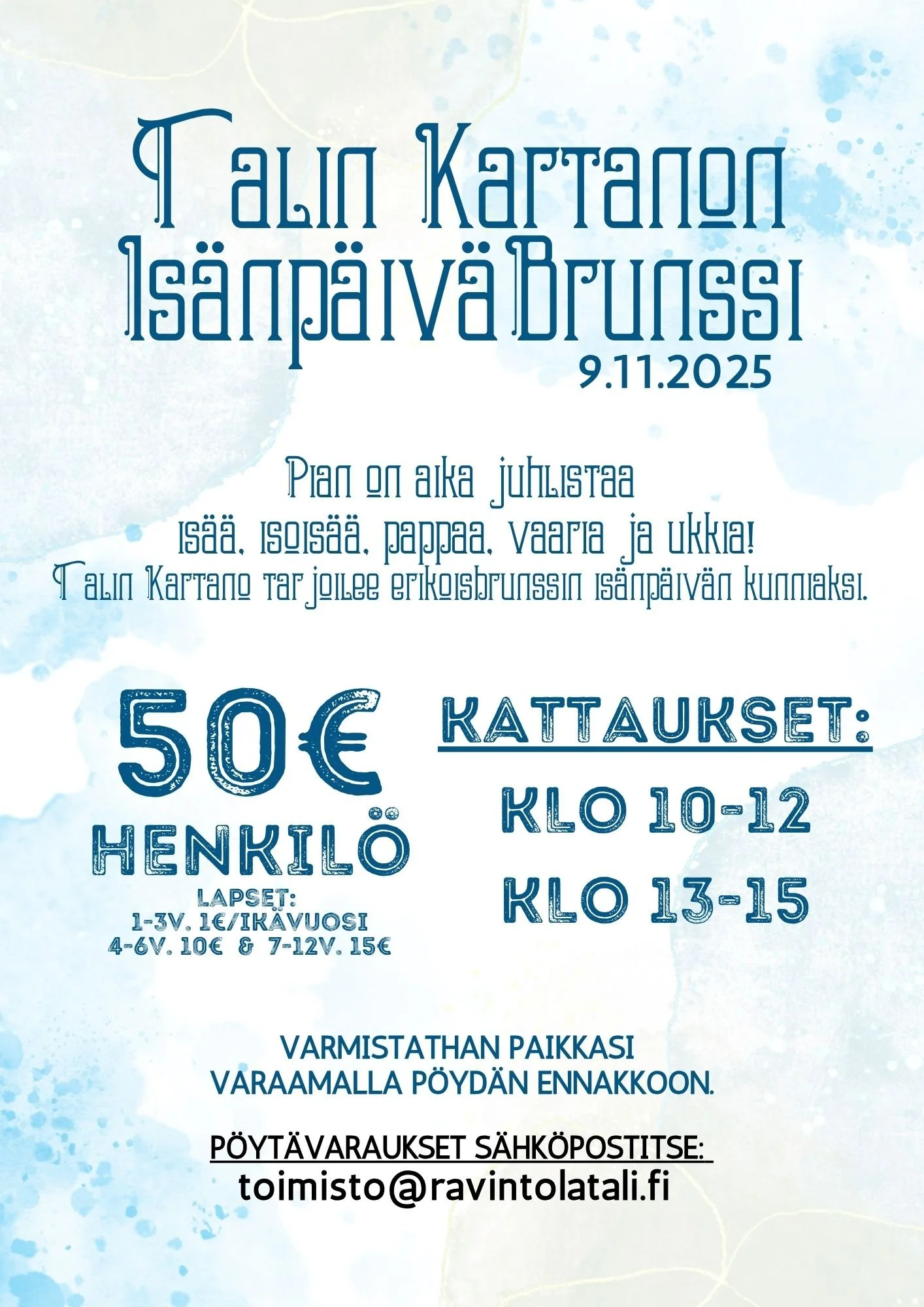 Brunssin hinta: 50€/henkilö, Lapset: 1-3v 1€/ikävuosi, 4-6V. 10€ & 7-12V. 15€